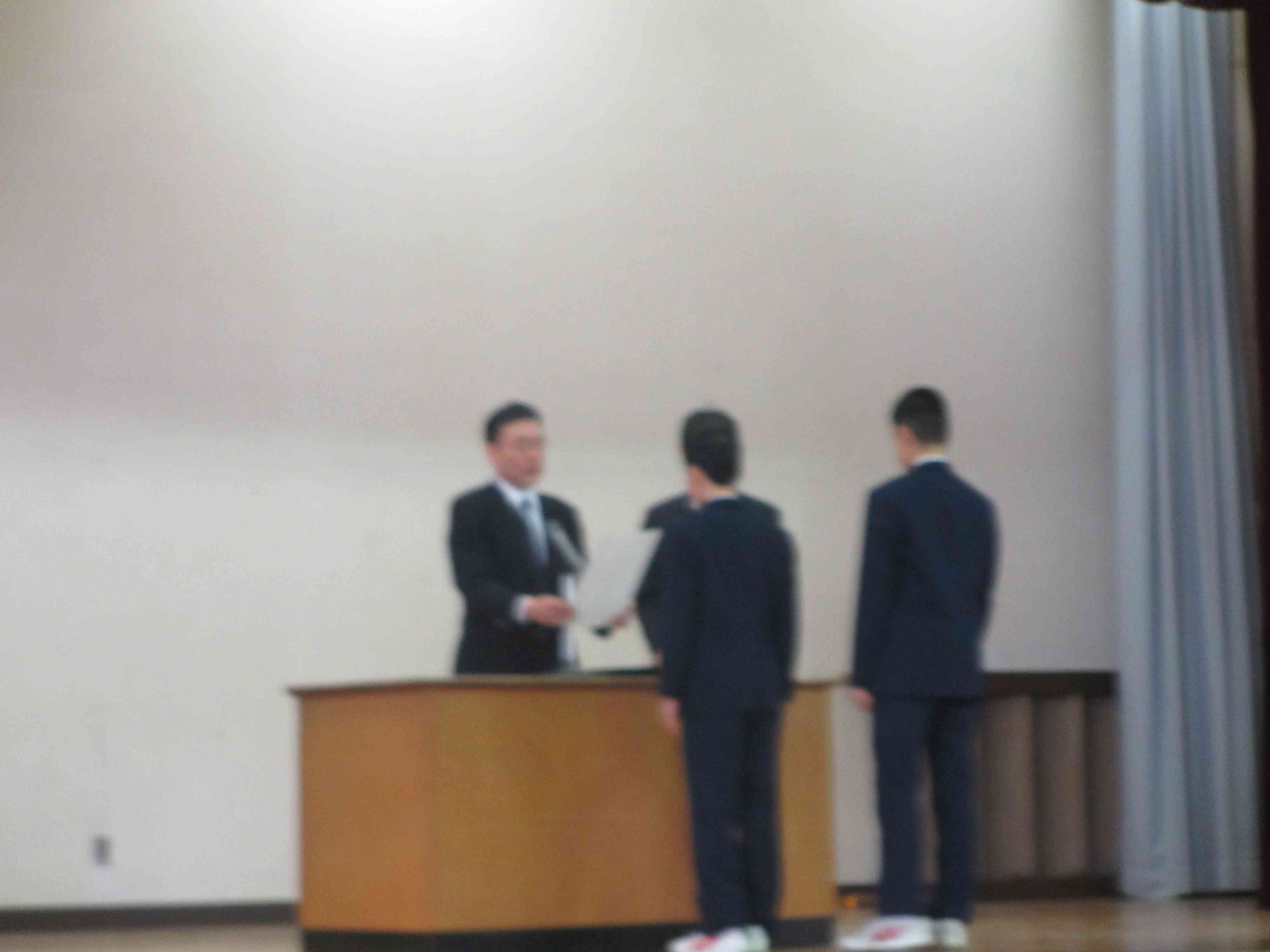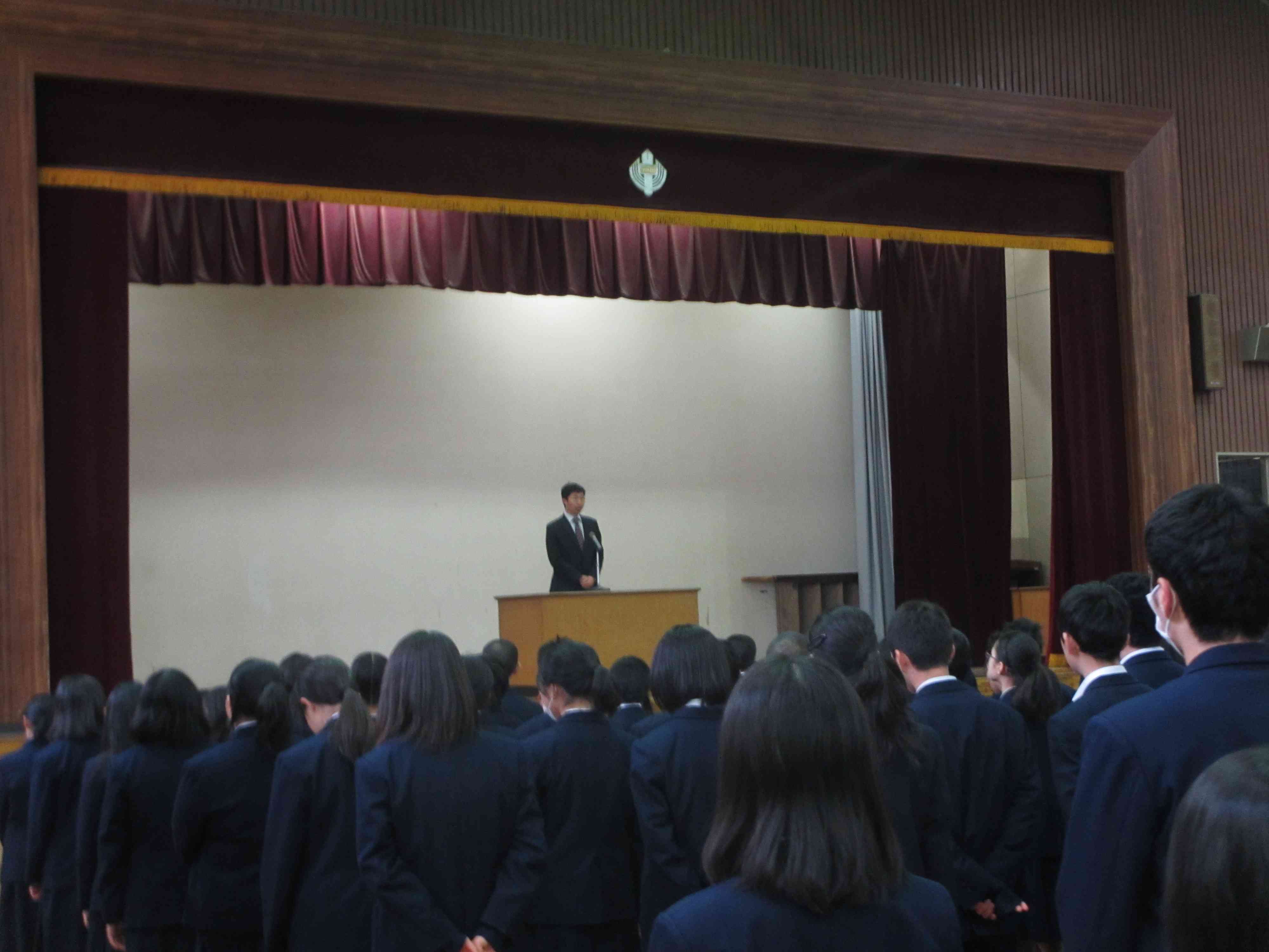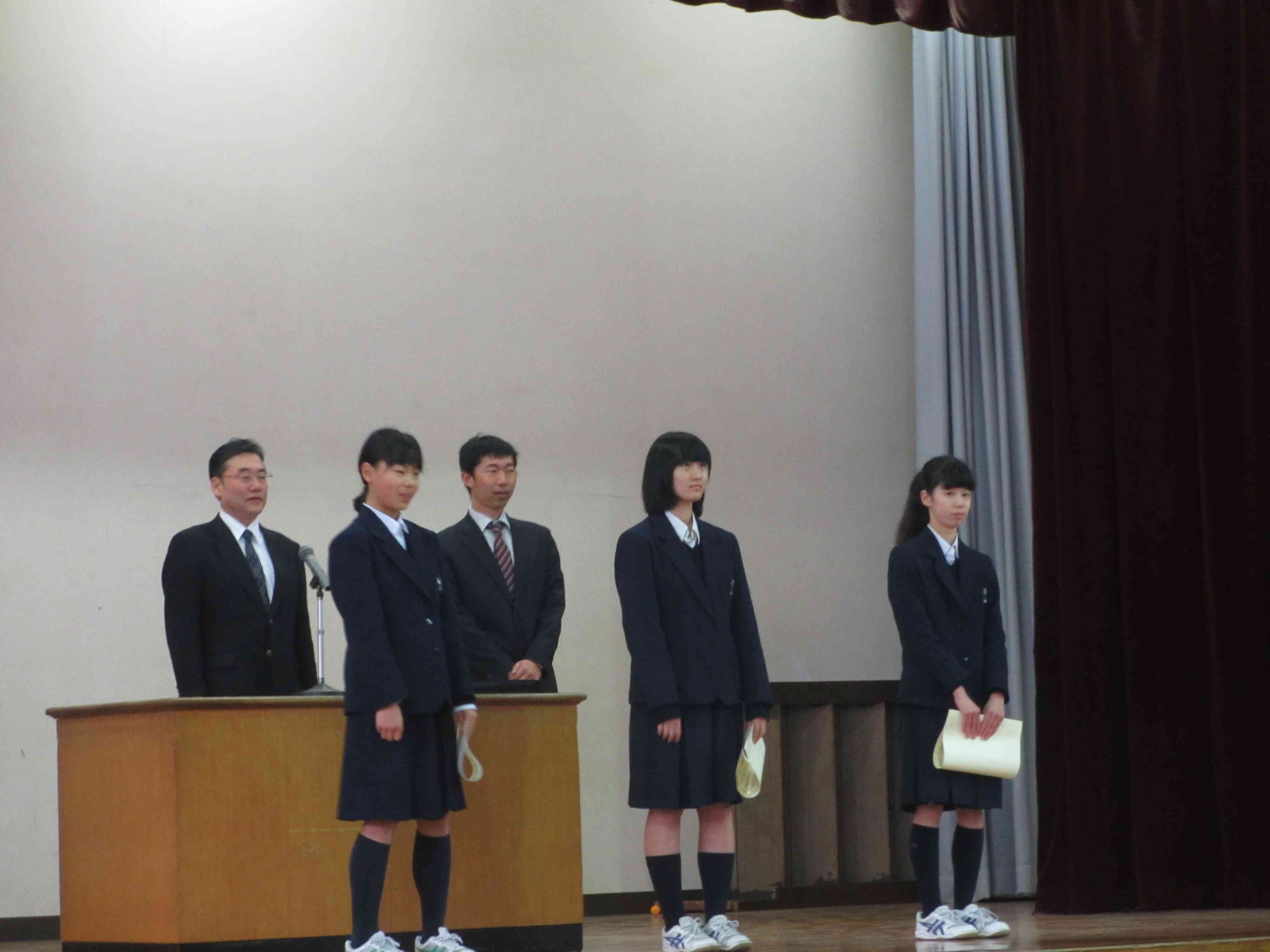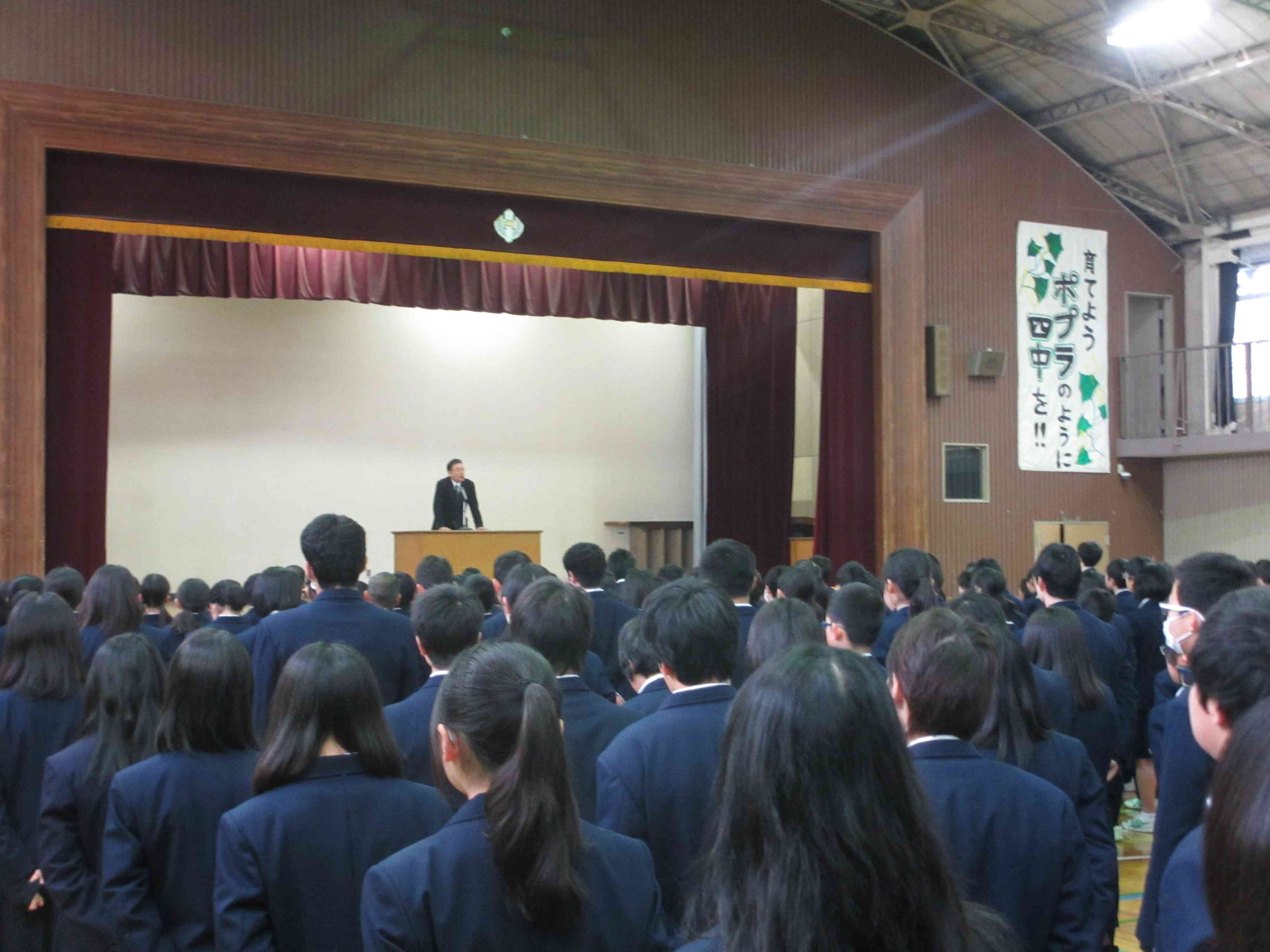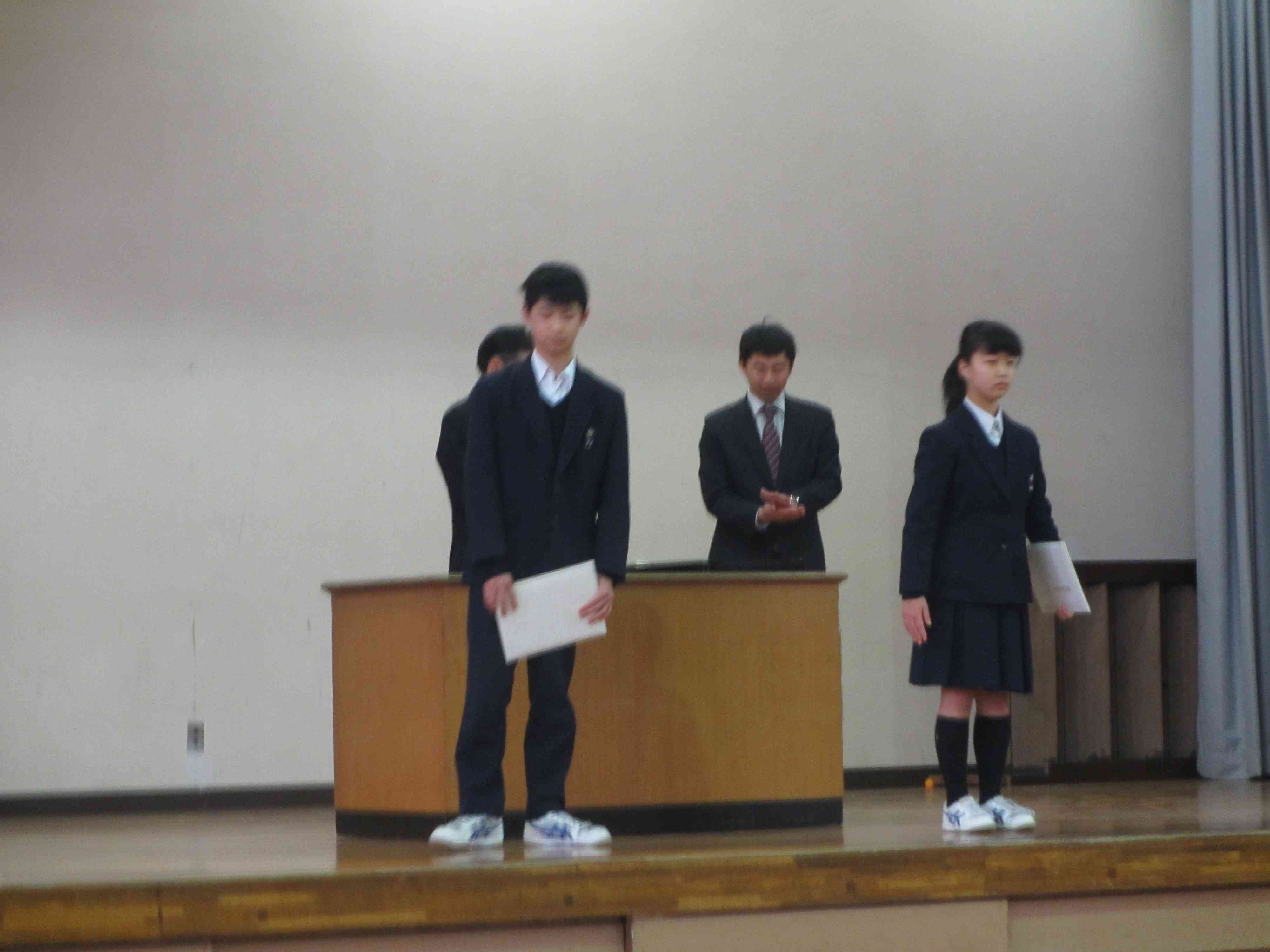 本日の朝礼の様子です。 校長先生「『いじめ』の卑劣さ、何気ない言葉が人を傷つけてしまうことがあり、絶対に許されないことである。」 生活指導主任「『いじめ』は人間として許されないこと。人それぞれが色々な感じ方があり、自分では何ともないことが嫌だと感じる人もいる。」 その後、東洋大学百人一首、人権作文、バドミントン部の表彰を行いました。