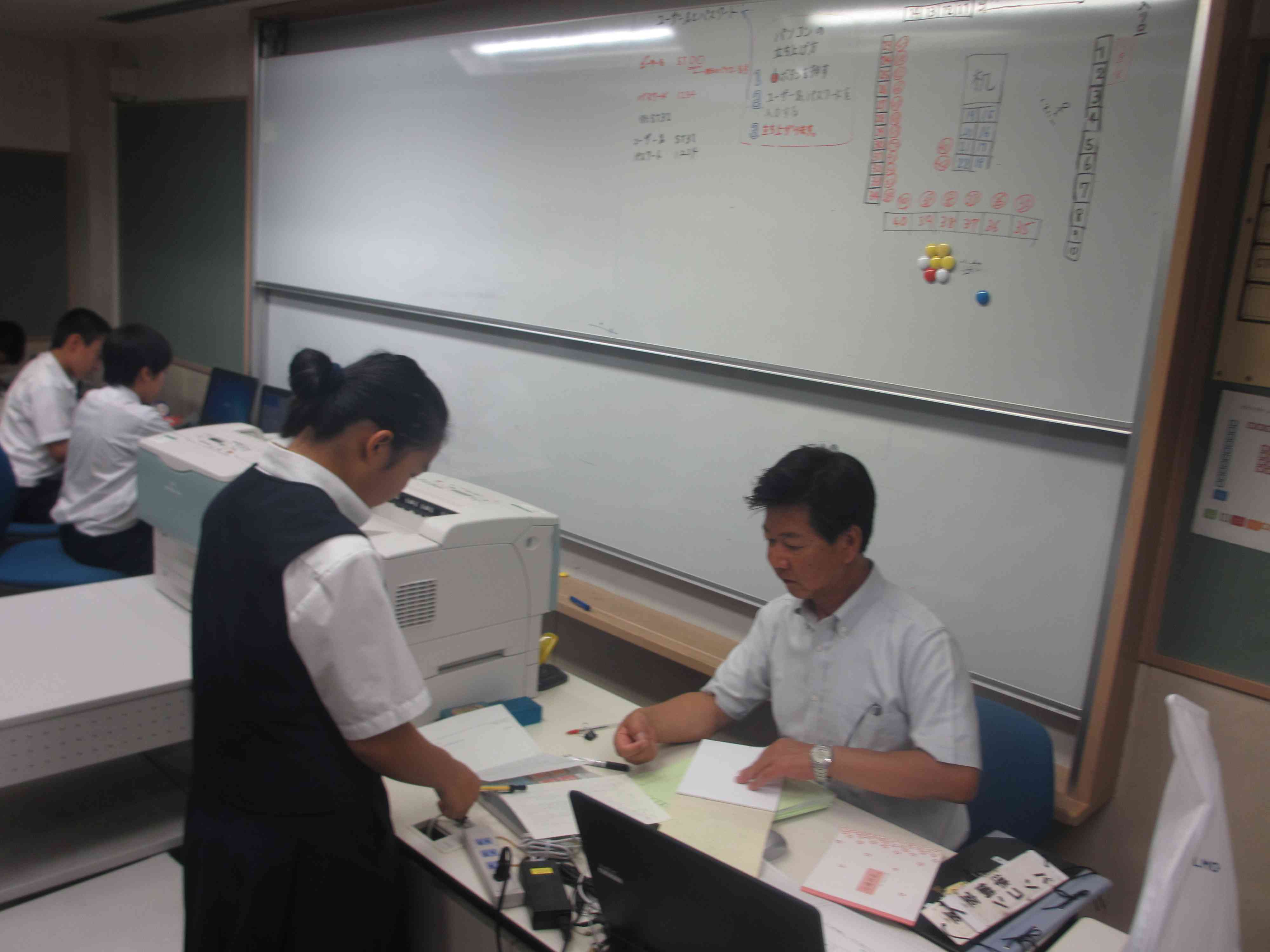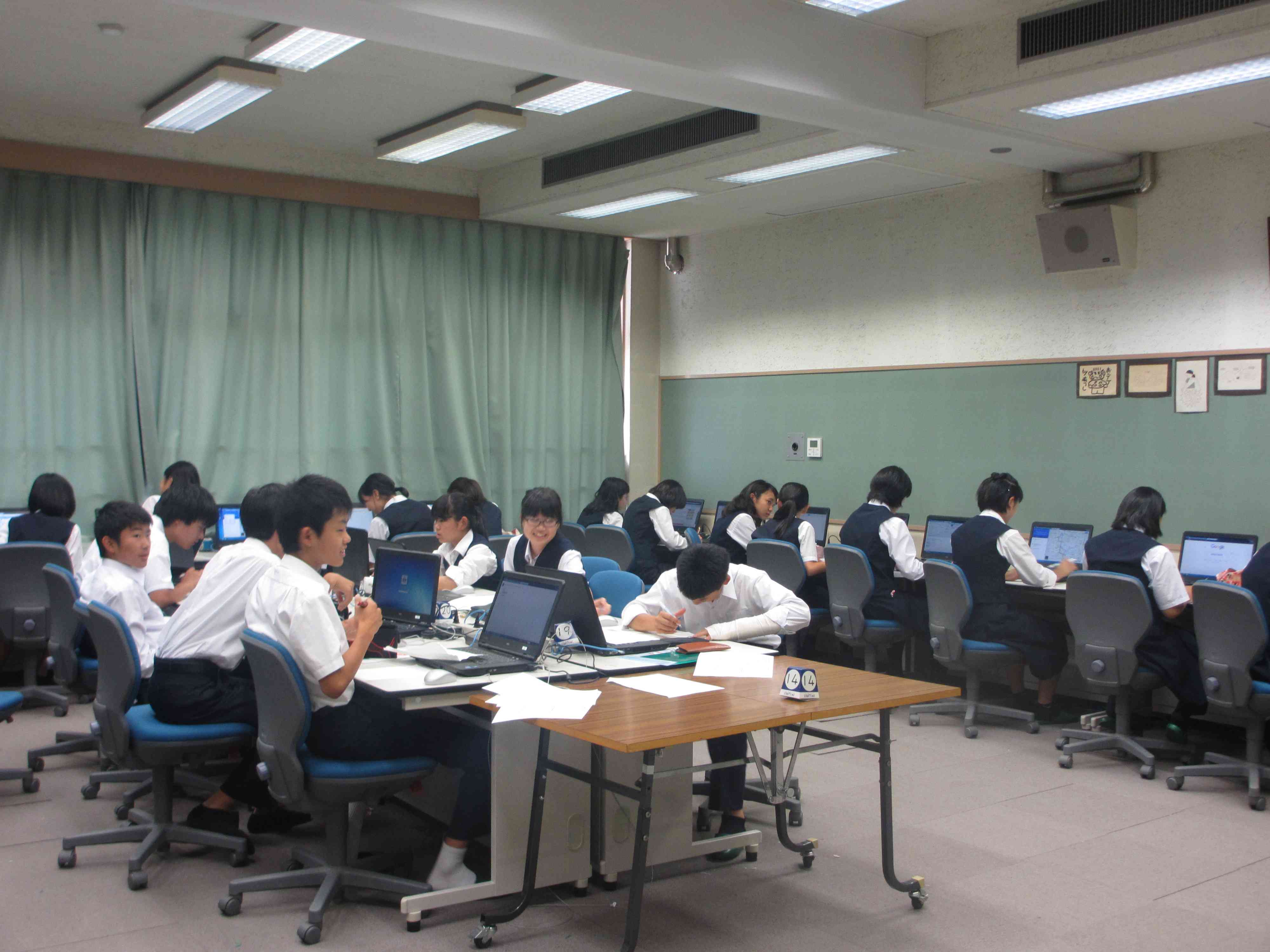 ・1クラスを複数の先生で教えるティームティーチングが1年生数学で始まりました。分からないことはすぐに教えてもらいましょう。 ・英語のALTの授業 ・パソコン室で調べ学習の様子
