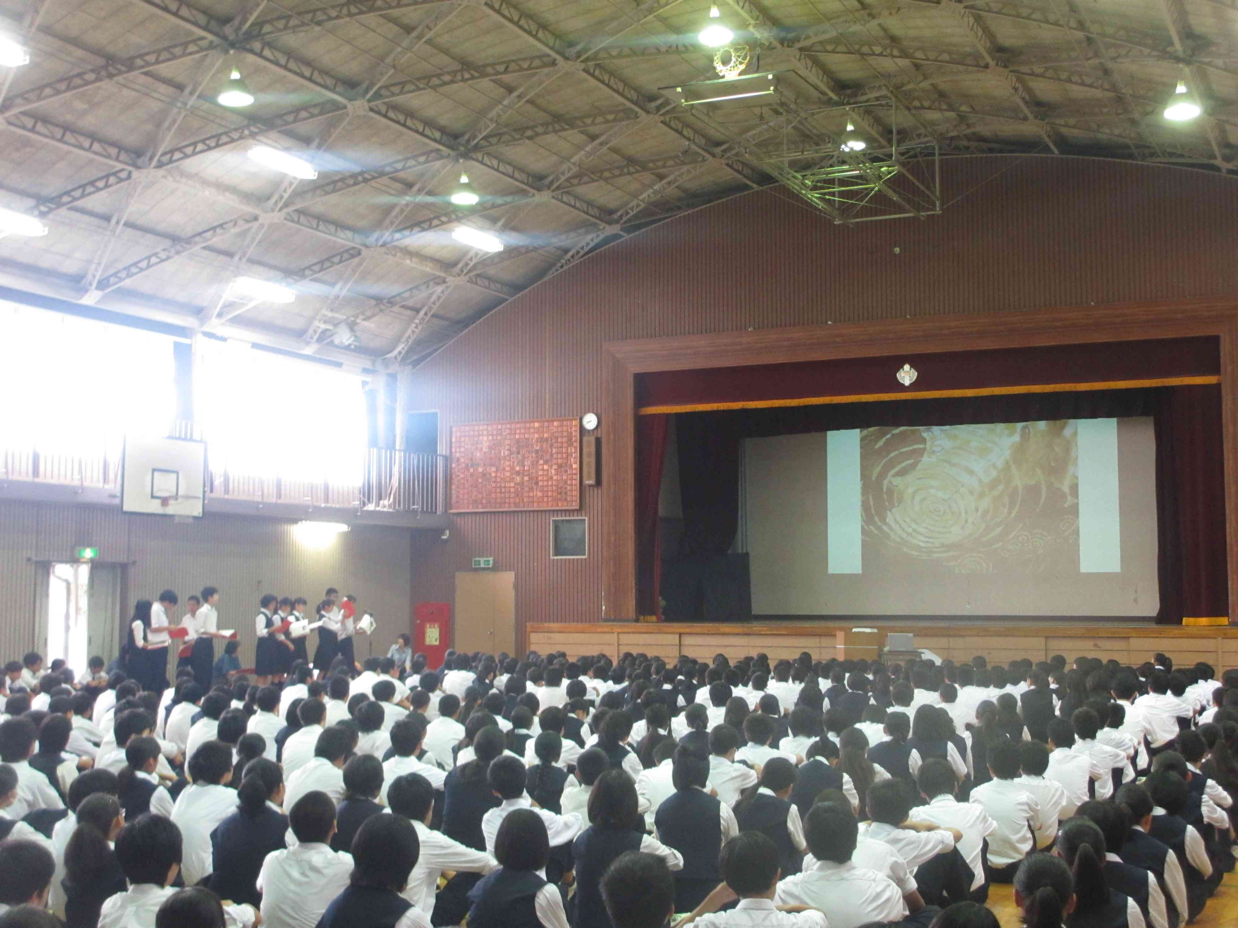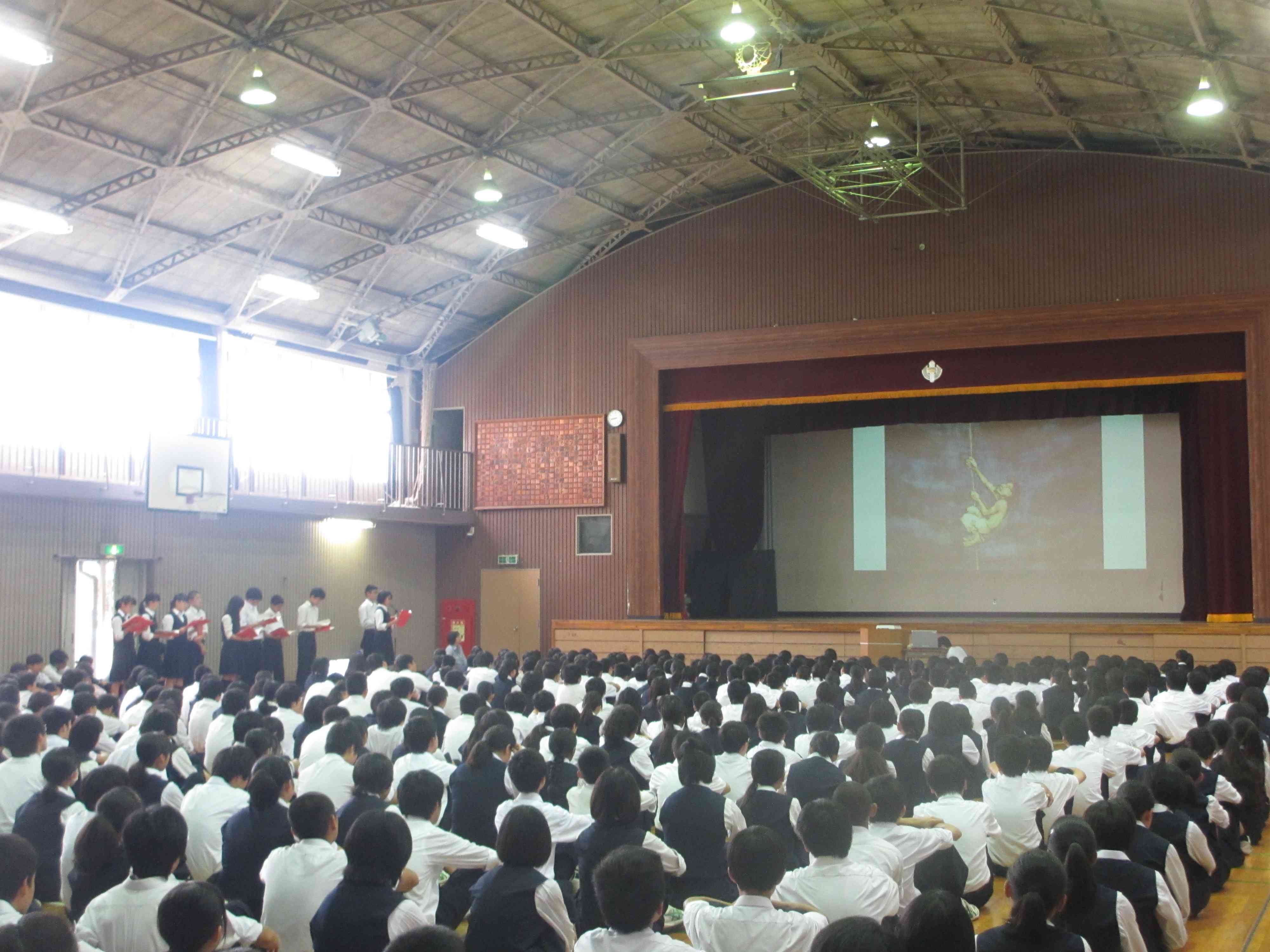 ・生徒会朝礼で図書委員会による読み聞かせを行いました。芥川龍之介の「蜘蛛の糸」を図書委員が読み、読書の面白さや、奥深さを生徒全員で共有することができました。