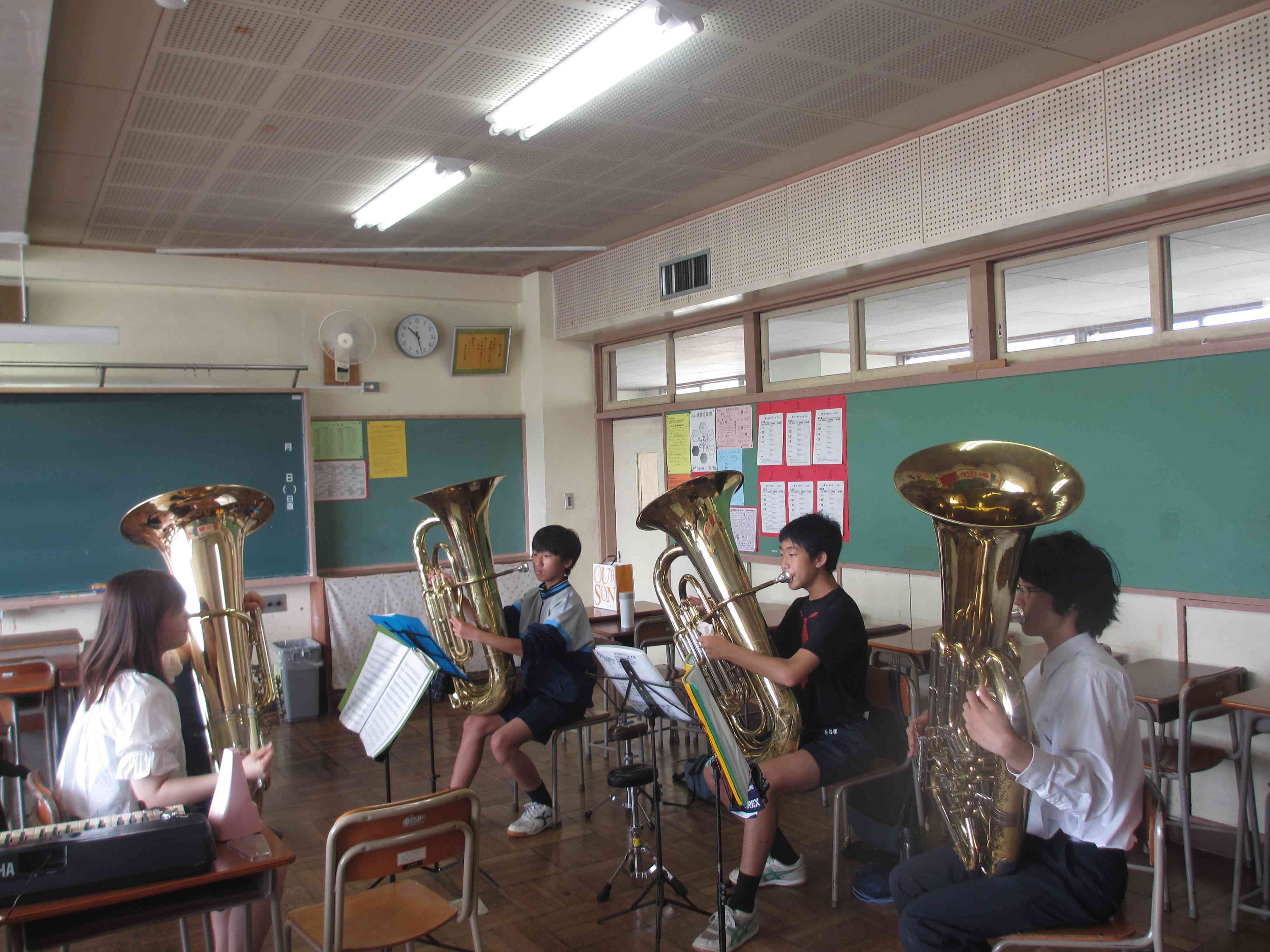・夏は木の伸びが早くて大変です。 ・男子バスケットボール部 ・体育館の男子トイレの臭いを少なくする方法 ・吹奏楽部の練習風景