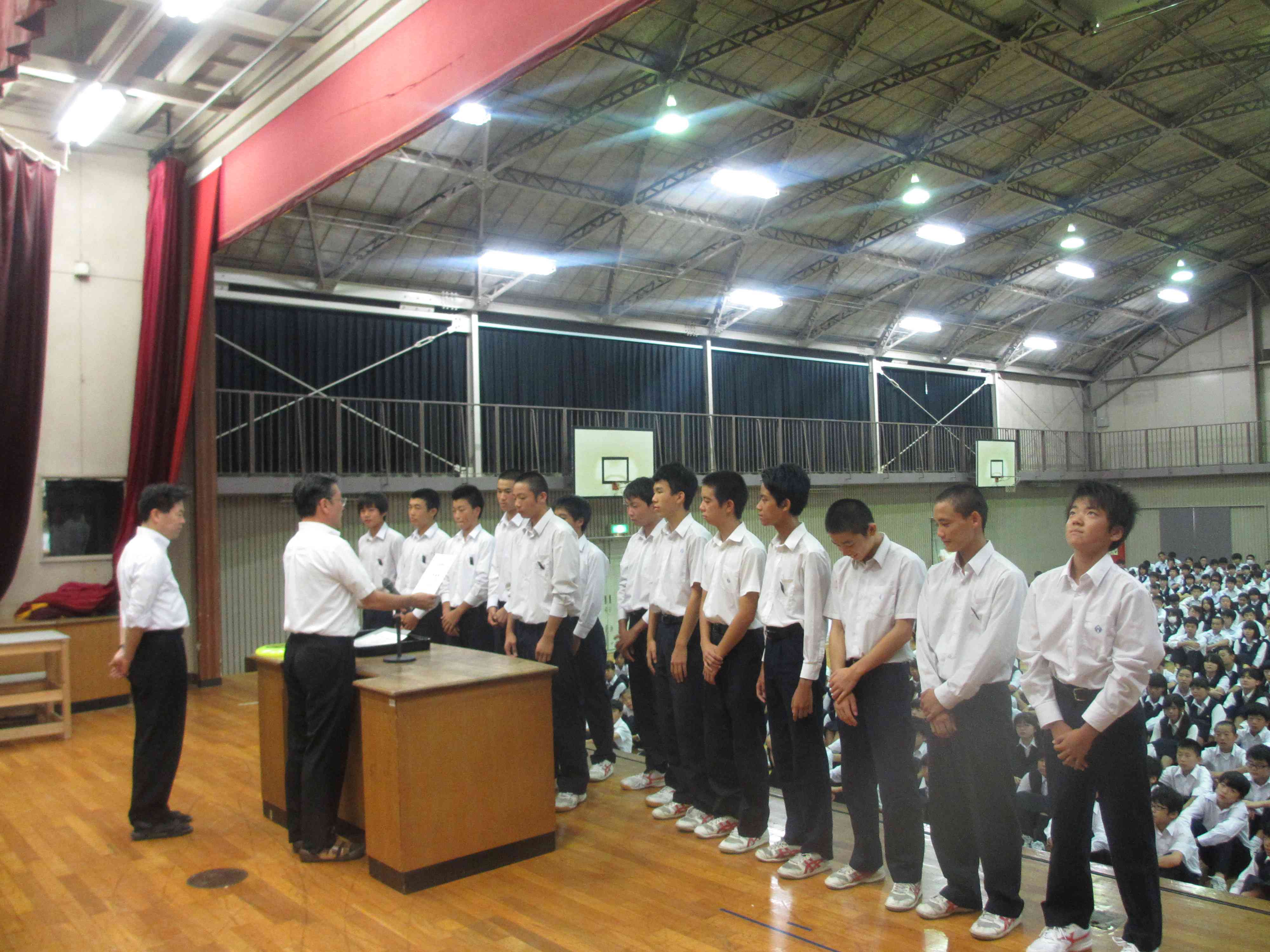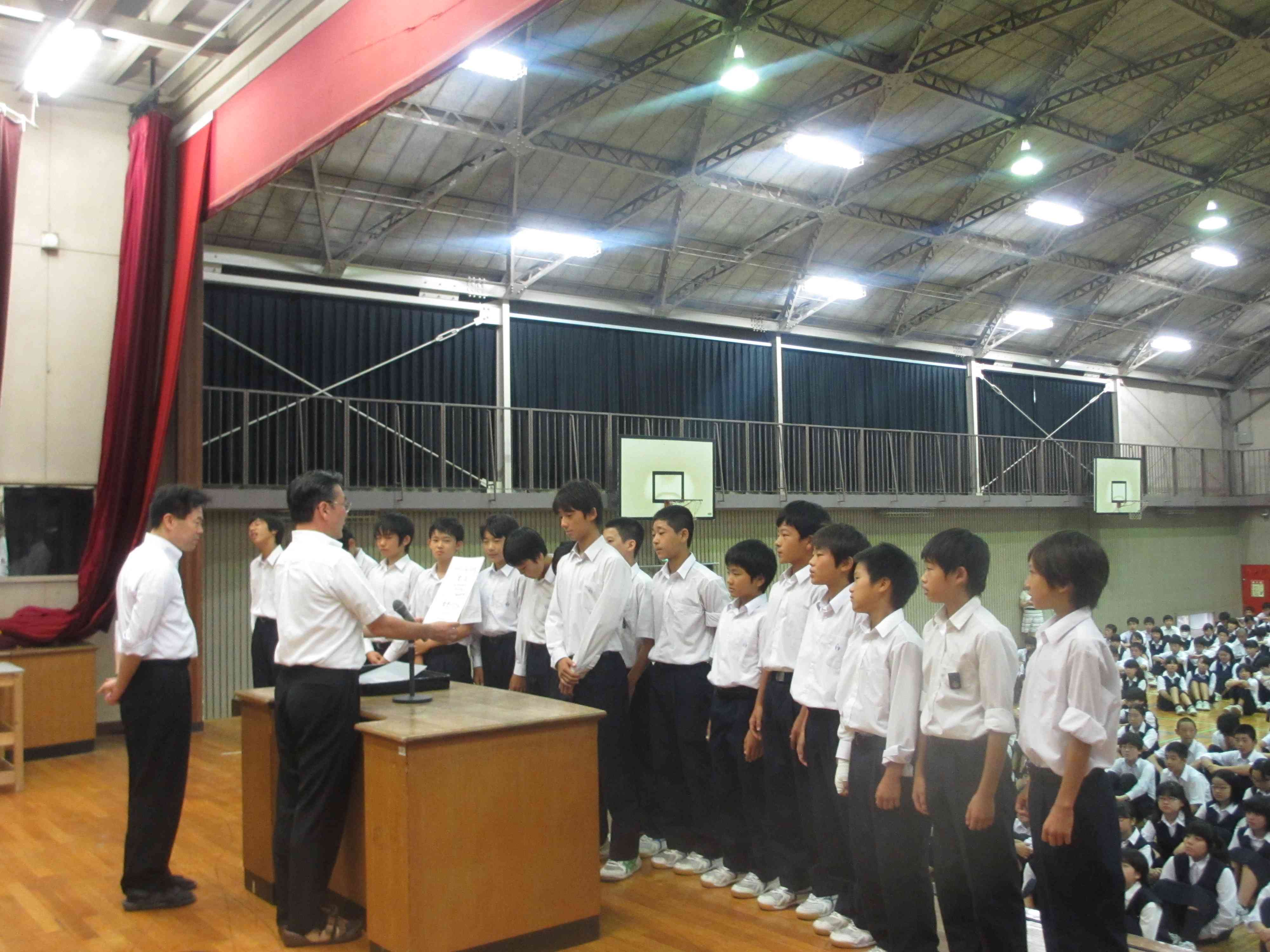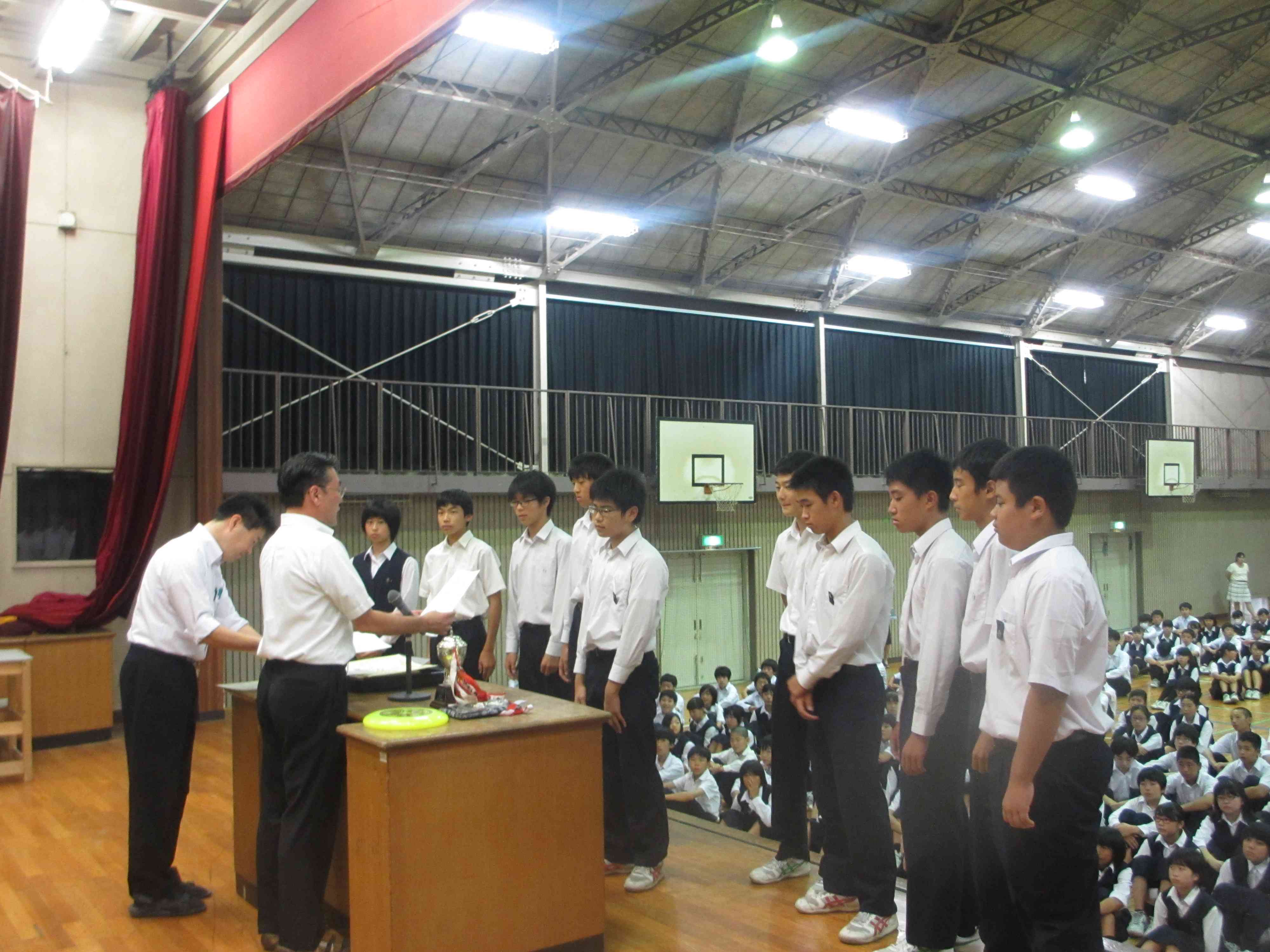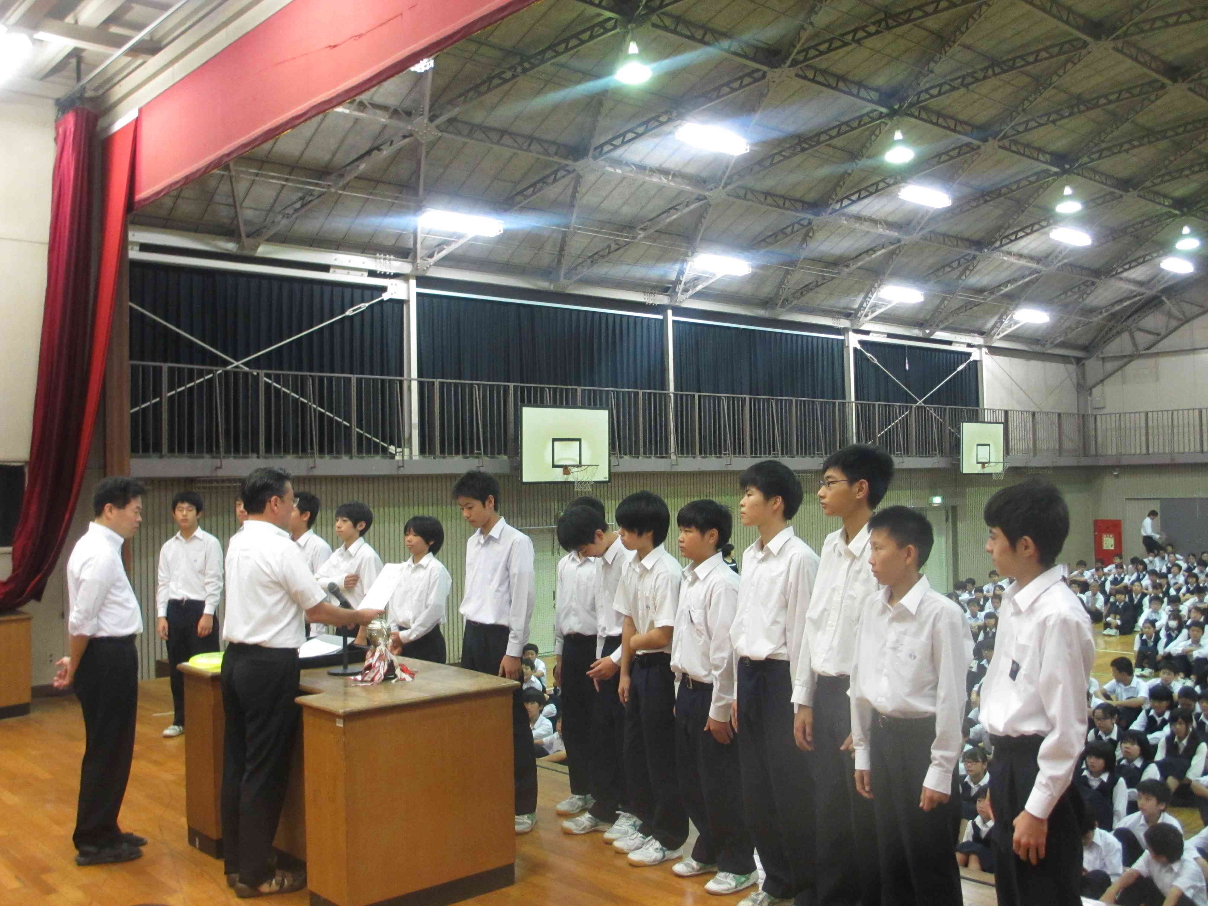 ★各部活動の表彰が行われました。 ・陸上競技部 ・男子バスケットボール部 市内大会:優勝 ・女子バレー部 市内大会:優勝 ・サッカー部 市内大会:準優勝 ・3年有志 全国ユースアルティメット選手権大会:準優勝