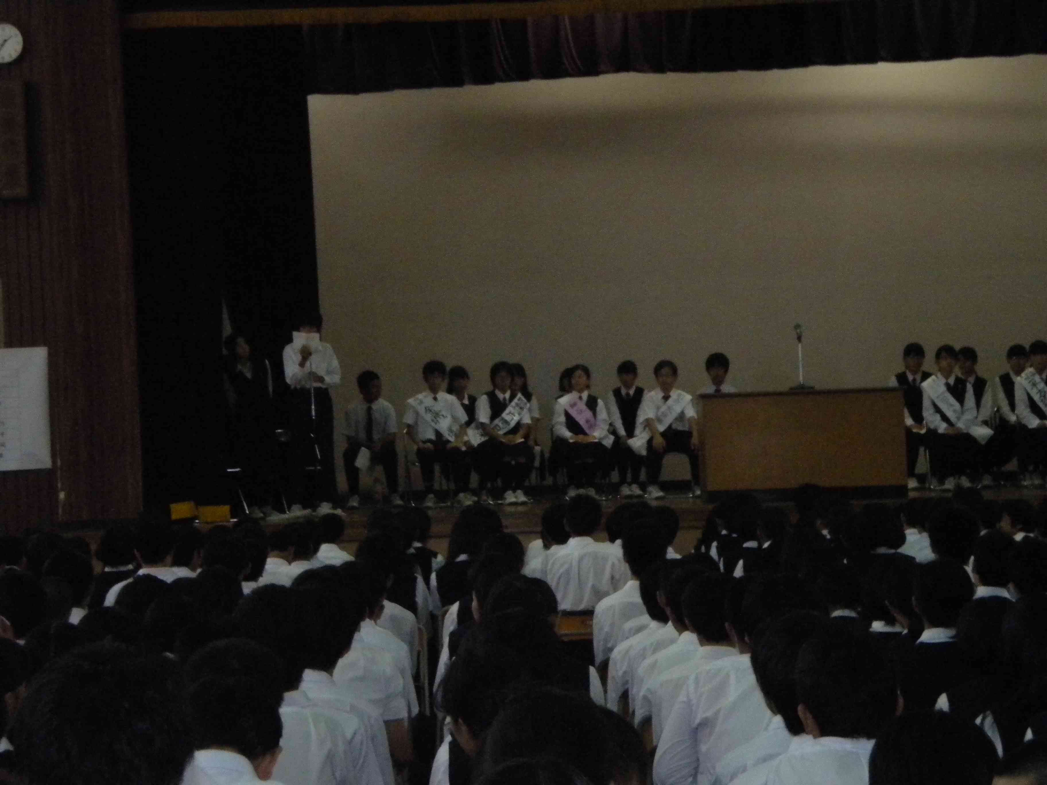 9/4(金)の5,6校時に、今後の生徒会役員を決める立会演説会そして投票が行われました。 後期から生徒会を運営する人物を決める大事な選挙ということで、生徒たちは静かに各候補者の演説を聞いていました。 候補者たちも、それぞれの思いを全生徒の前でしっかりと述べていました。 また、選挙管理委員会の生徒たちの運営で、無事に選挙が終了しました。