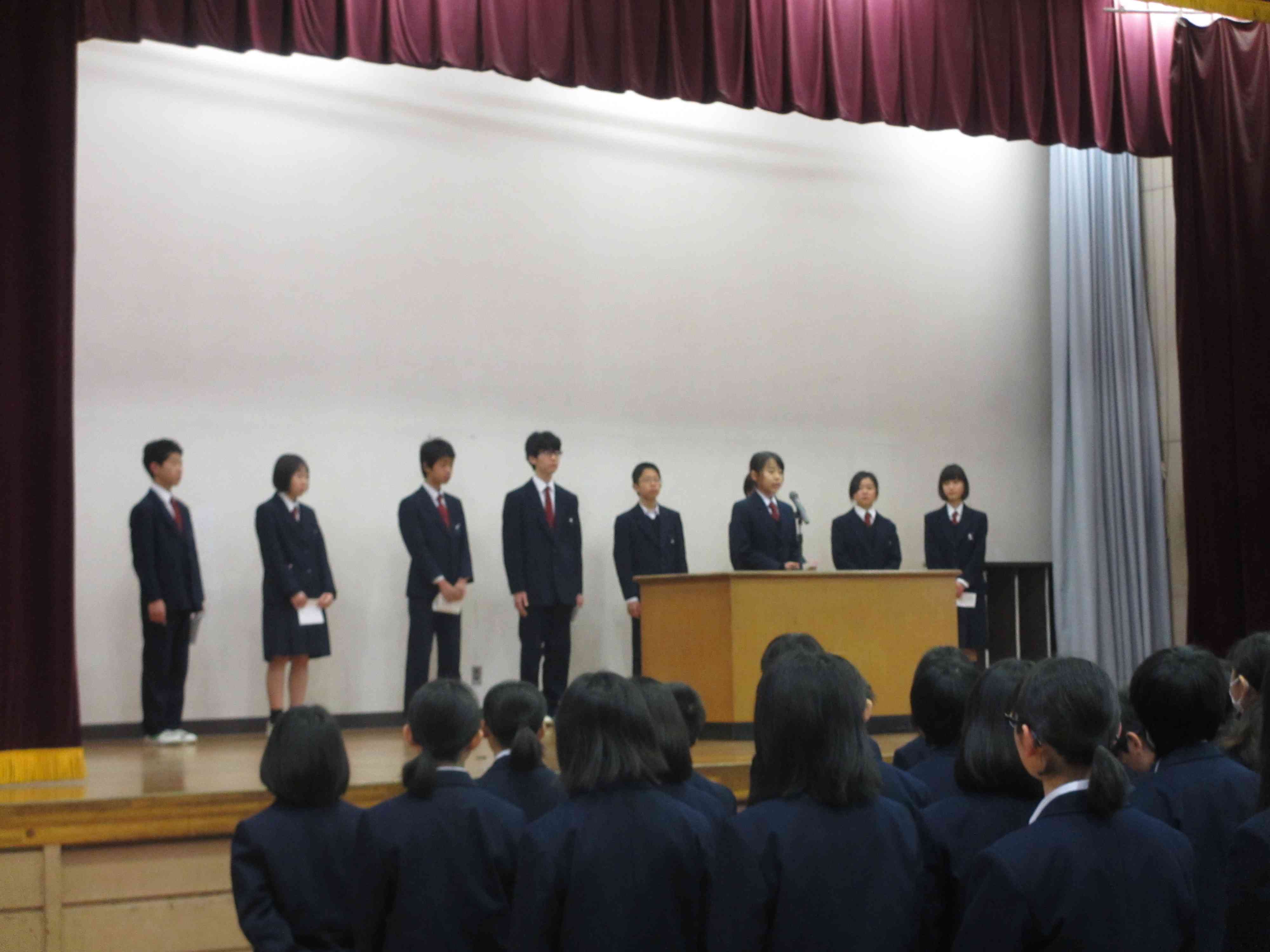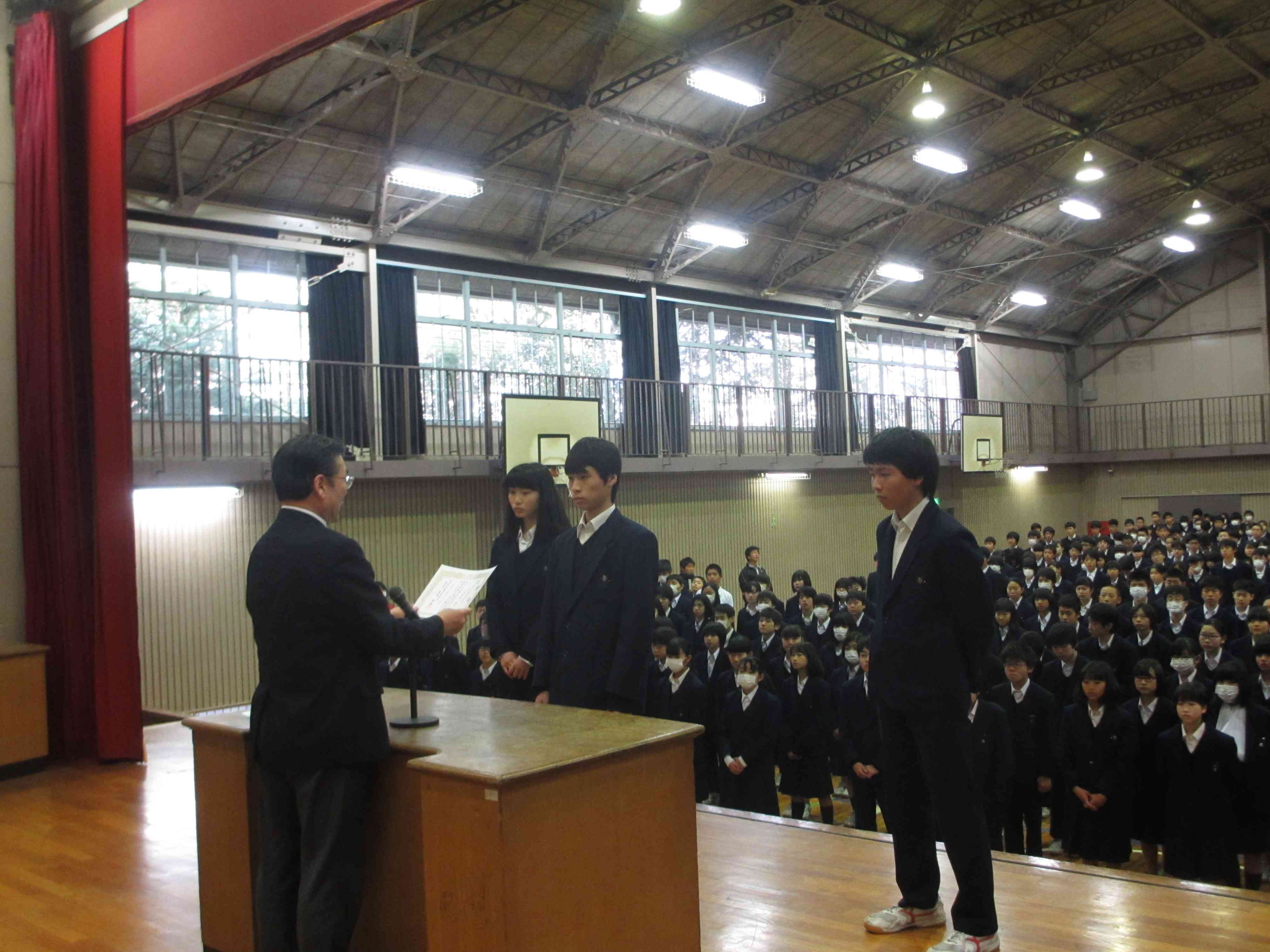 3/6(月) 生徒朝礼 東大和市俳句展表彰の様子