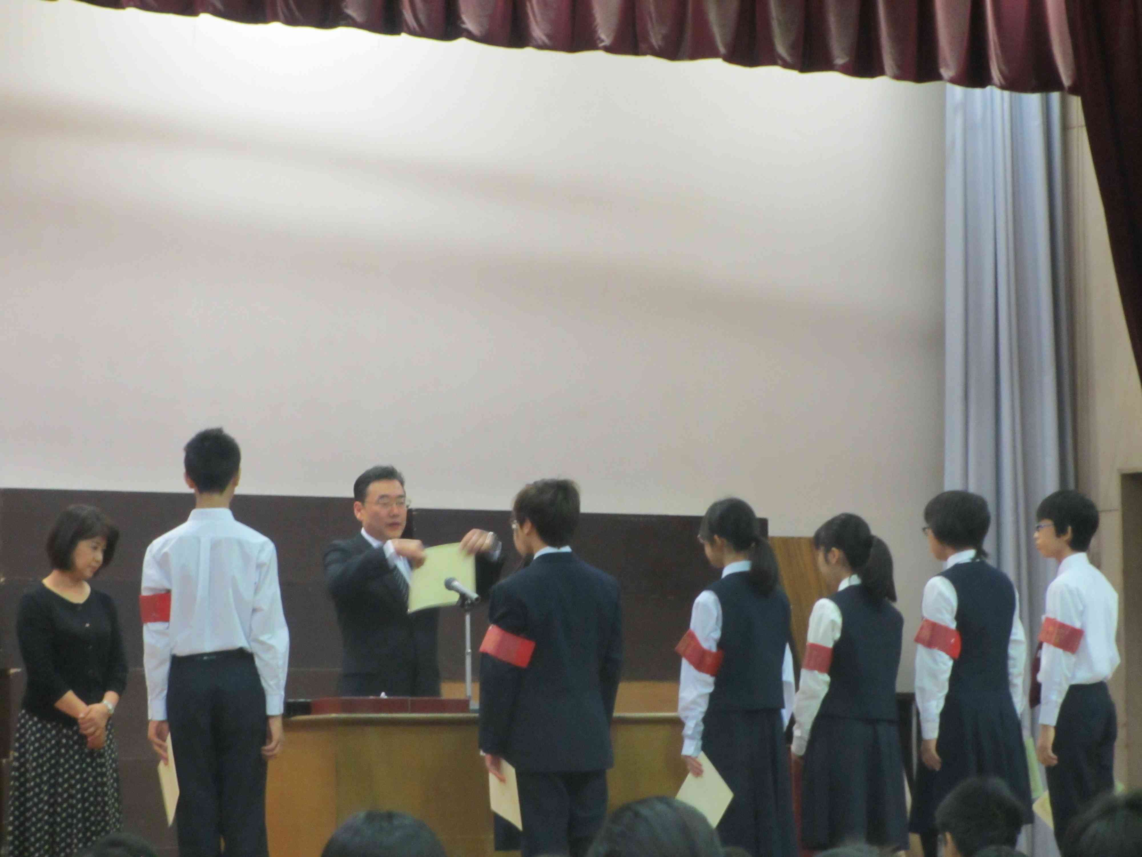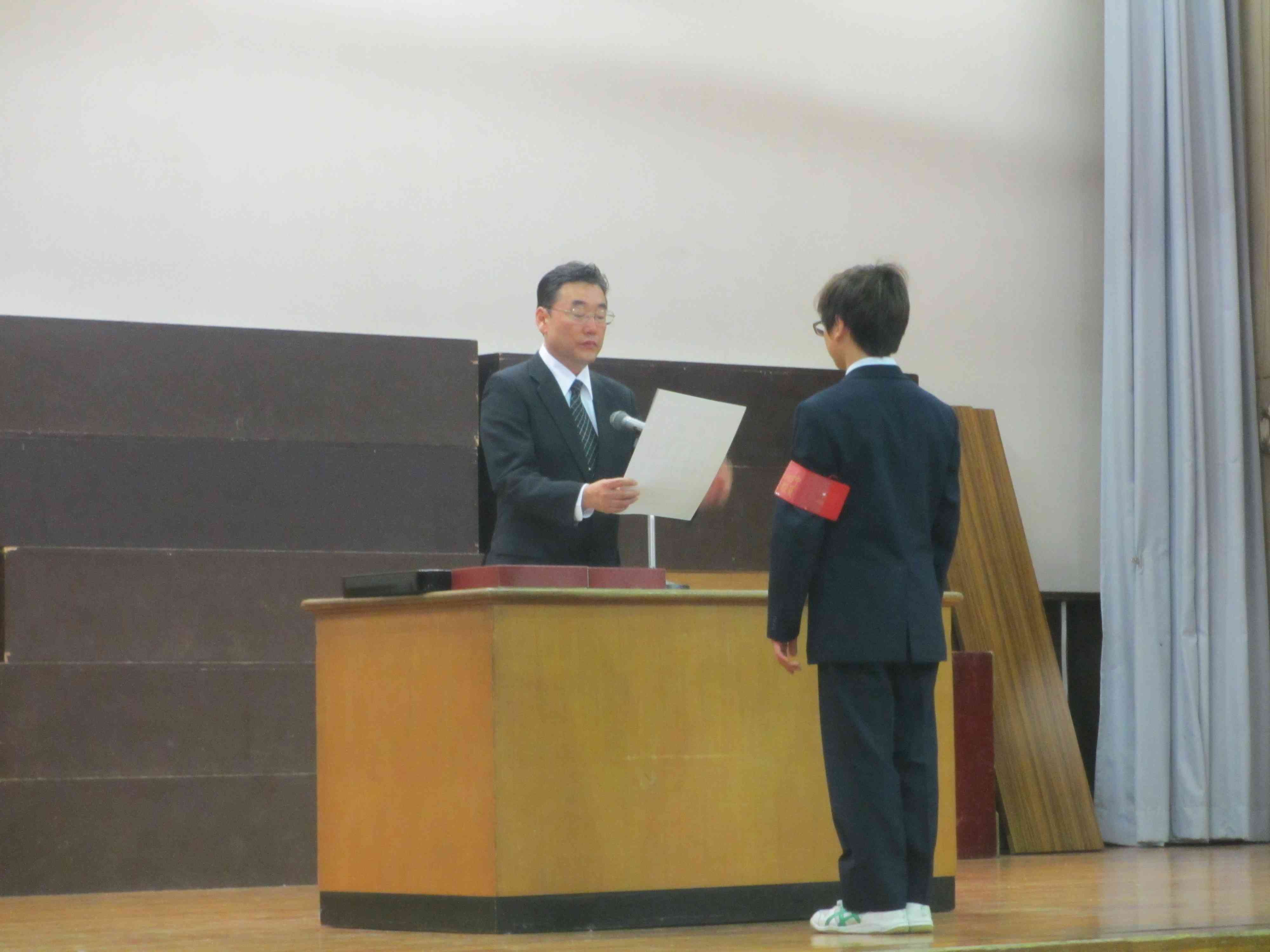 新しい生徒会役員の認証式です。 新生徒会長のお話。 陸上部・柔道・水泳の表彰が行われました。